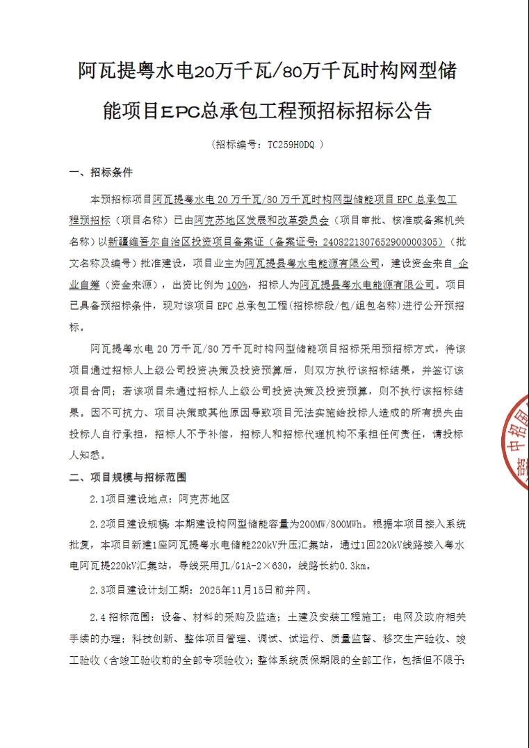 4月30日,阿瓦提县粤水电能源有限公司发布了阿瓦提粤水电20万千瓦/80万千瓦时构网型储能项目EPC总承包工程预招标招标公告,项目位于新疆阿克苏地区,本期建设构网型储能容量为 200MW/800MWh。根据本项目接入系统批复,本项目新建1座阿瓦提粤水电储能220kV升压汇集站,通过1回220kV线路接入粤水电阿瓦提220kV汇集站,导线采用JL/G1A-2×630,线路长约0.3km。