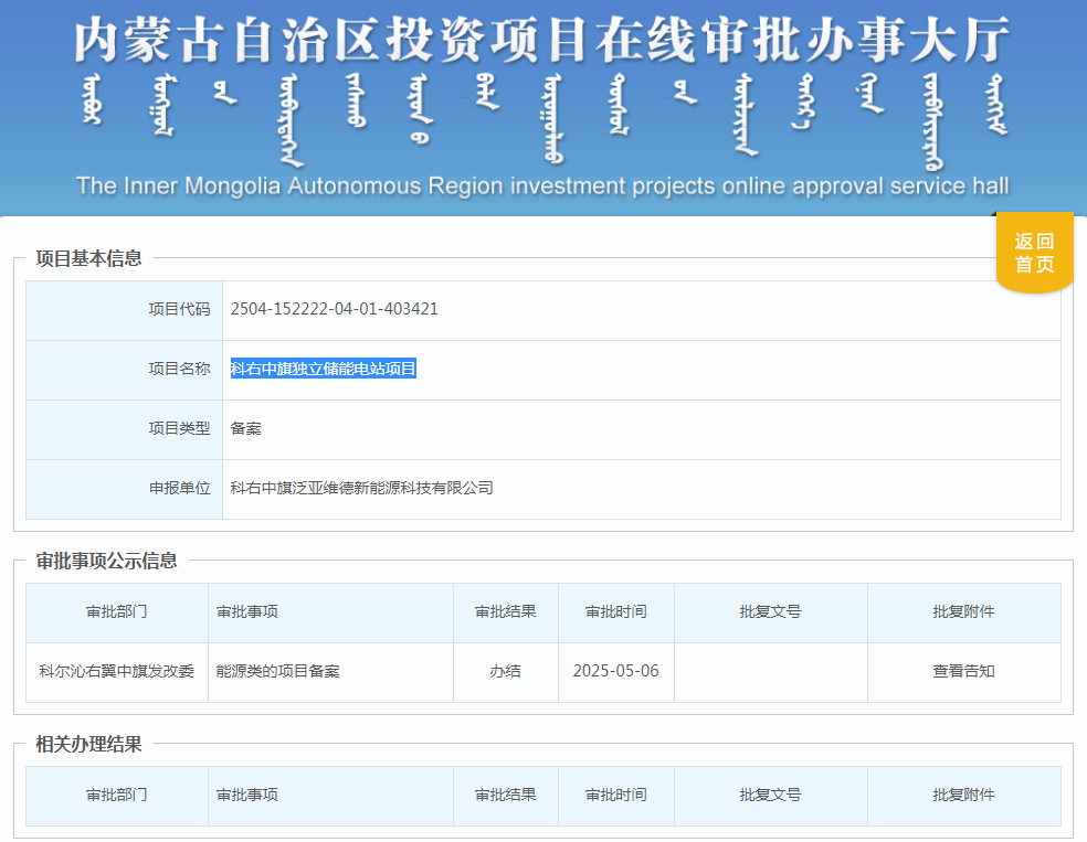近日,科右中旗泛亚维德新能源科技有限公司科右中旗独立储能电站项目获备案。