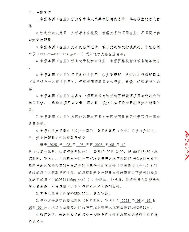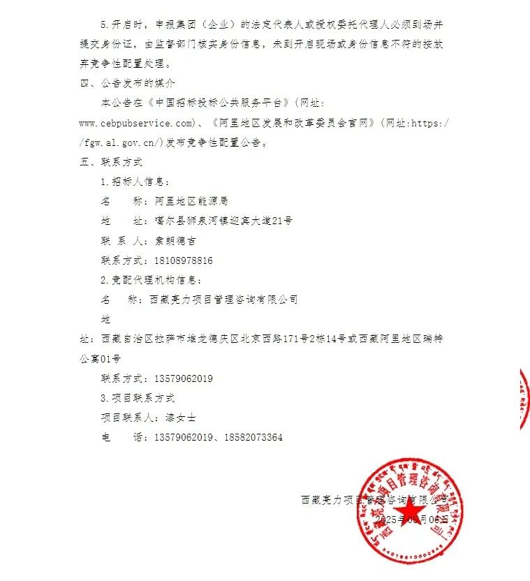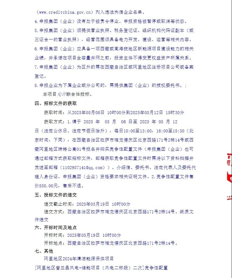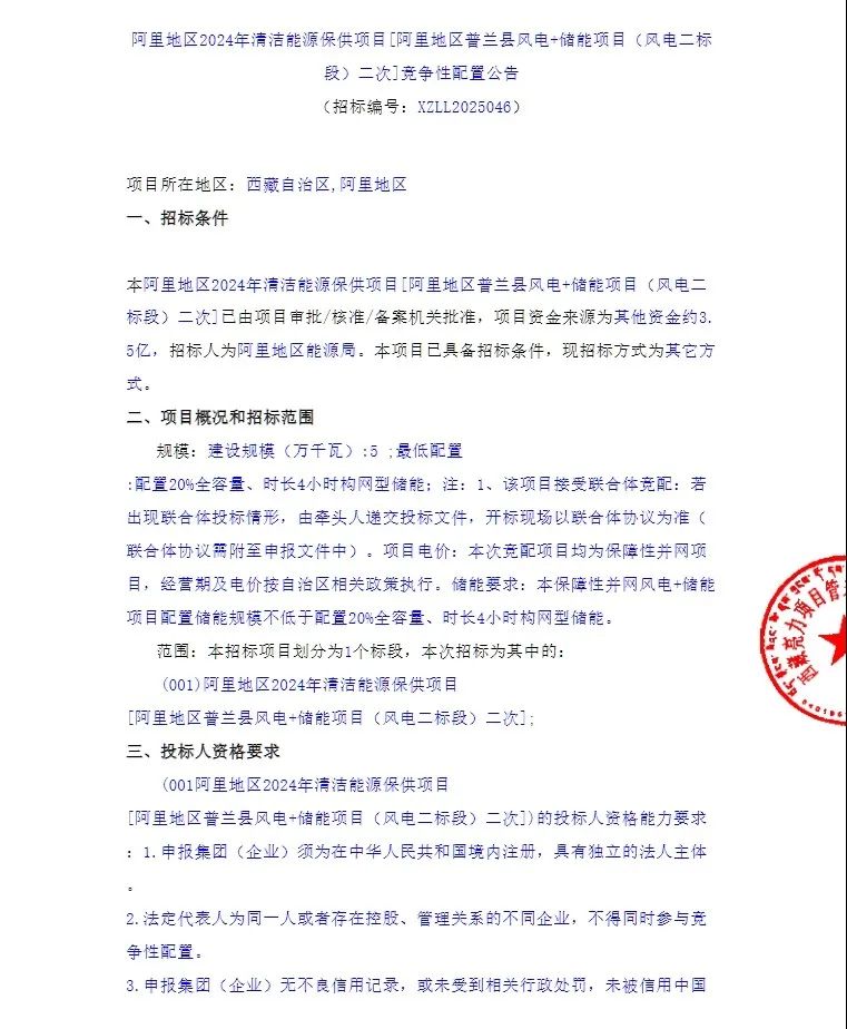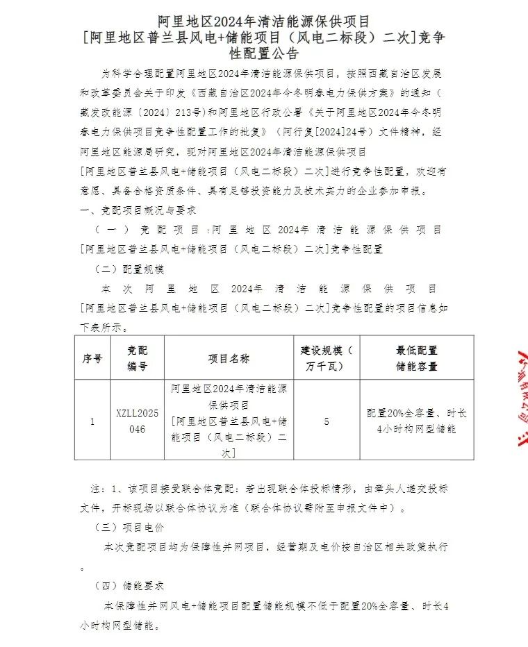 5月6日,西藏阿里地区2024年清洁能源保供项目[阿里地区普兰县风电+储能项目(风电二标段)二次]竞争性配置公告发布。