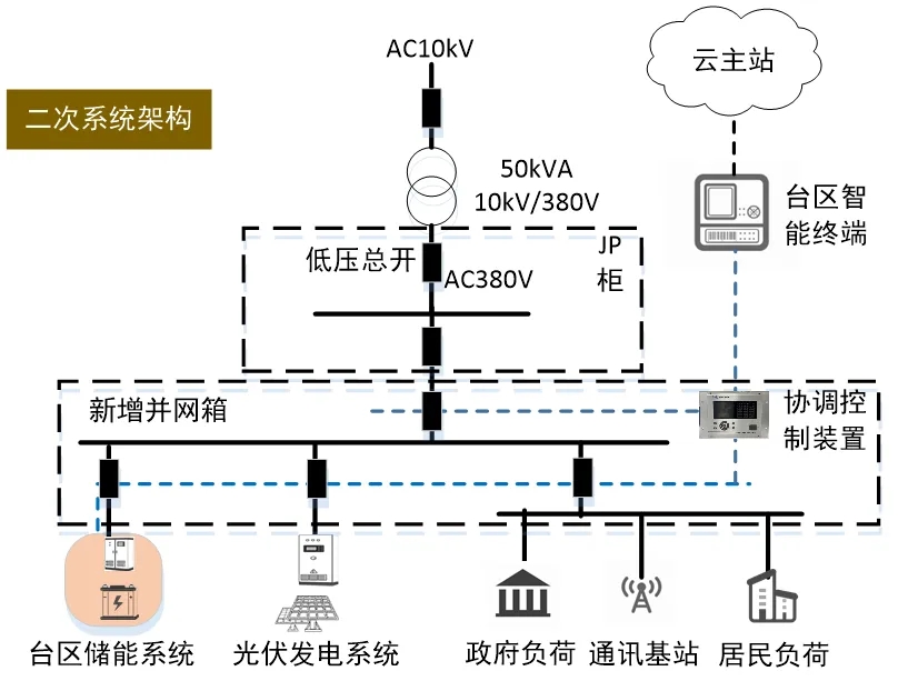 国电南瑞配电公司在台区侧围绕协调控制装置分别建设台区分布式储能、新能源并网控制柜、光伏发电系统,针对地理位置和施工条件采用一体化屏柜设计方案,对台区内源网荷储资源进行充分规划与运用,屏柜具有占地面积小,安装部署快捷等特点。为台区储能系统配置图形化人机界面,便于运维与系统监视,通过台区智能终端将信号送至云站系统,配合云主站的统一调控,形成实用化的保供型新能源微电网台区自治系统架构。