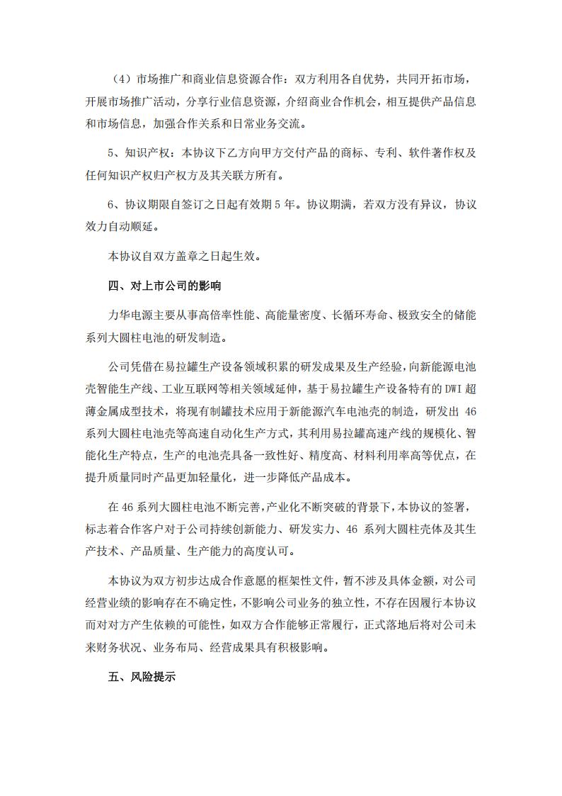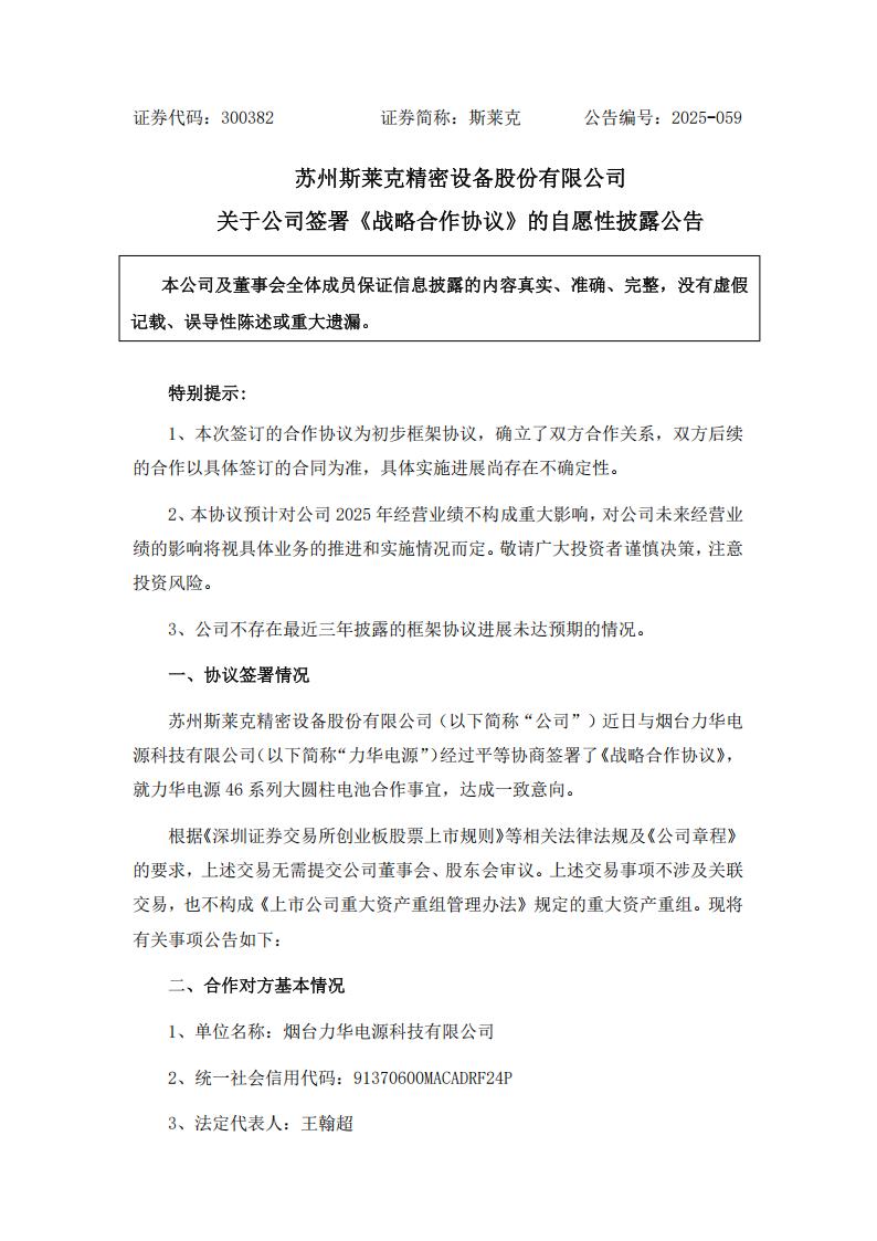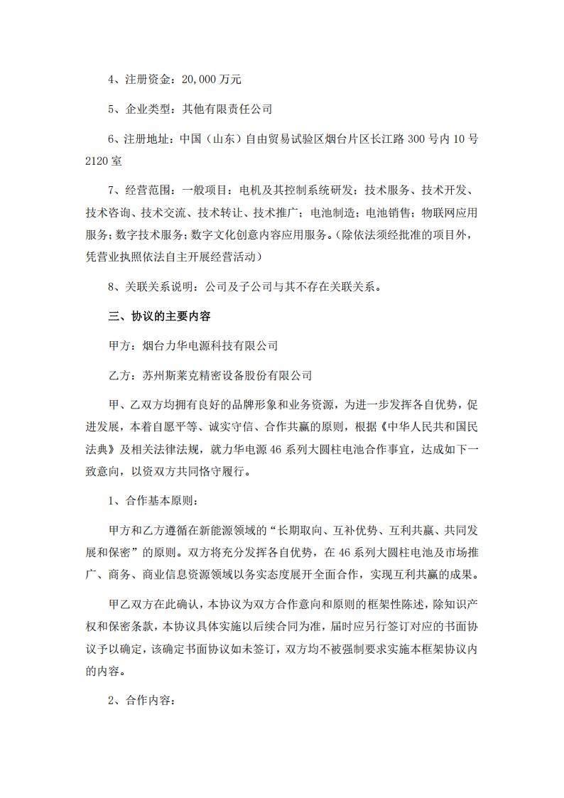 公告显示,斯莱克近日与烟台力华电源科技有限公司(以下简称“力华电源”)经过平等协商签署了《战略合作协议》,就力华电源 46 系列大圆柱电池合作事宜,达成一致意向。
