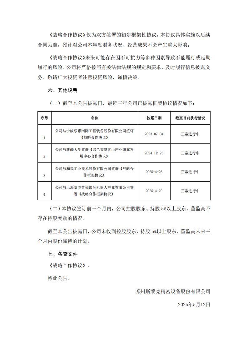 5月12日,斯莱克发布关于公司签署战略合作协议的自愿性披露公告。