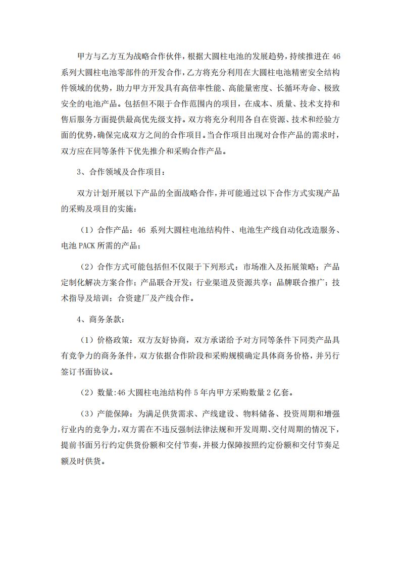 (1)合作产品:46 系列大圆柱电池结构件、电池生产线自动化改造服务、电池 PACK 所需的产品;