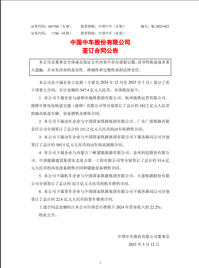 5月12日,中国中车股份有限公司(简称中国中车)公告称,公司及下属企业于近期(主要为2024年12月至2025年5月)签订了若干项重大合同,合计金额约547.4亿元人民币。