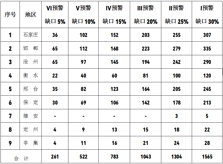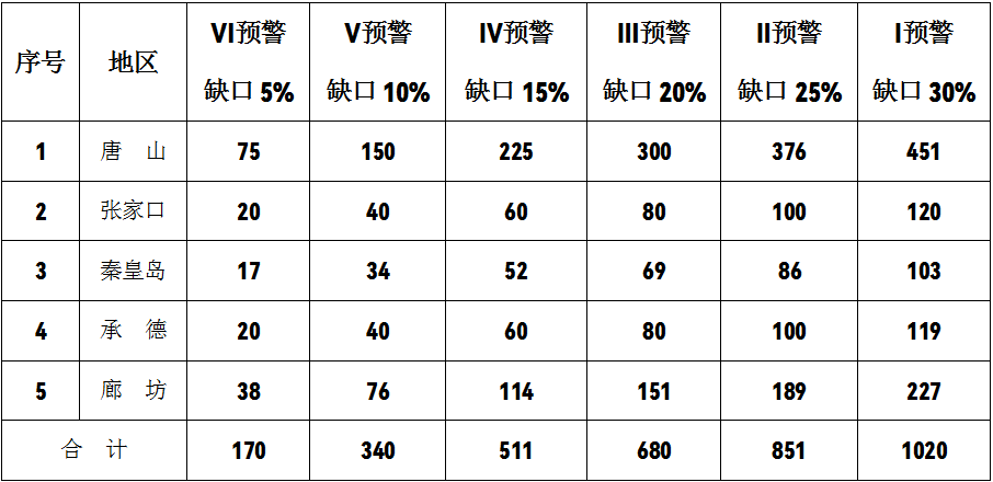 (四)出现长时间供应缺口,负荷管理前置措施持续时间为3天,在河北南网、冀北电网出现100万千瓦以内缺口且持续3天以上时,需同步启动需求响应措施。需求响应用户响应能力随着持续时间增加不断衰减,当河北南网出现500万千瓦(冀北电网出现350万千瓦)以内缺口持续时间较长用户应约容量不足时,需同步启动有序用电措施。