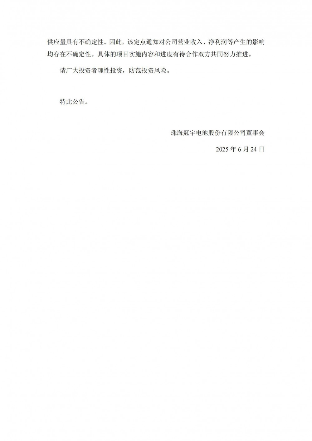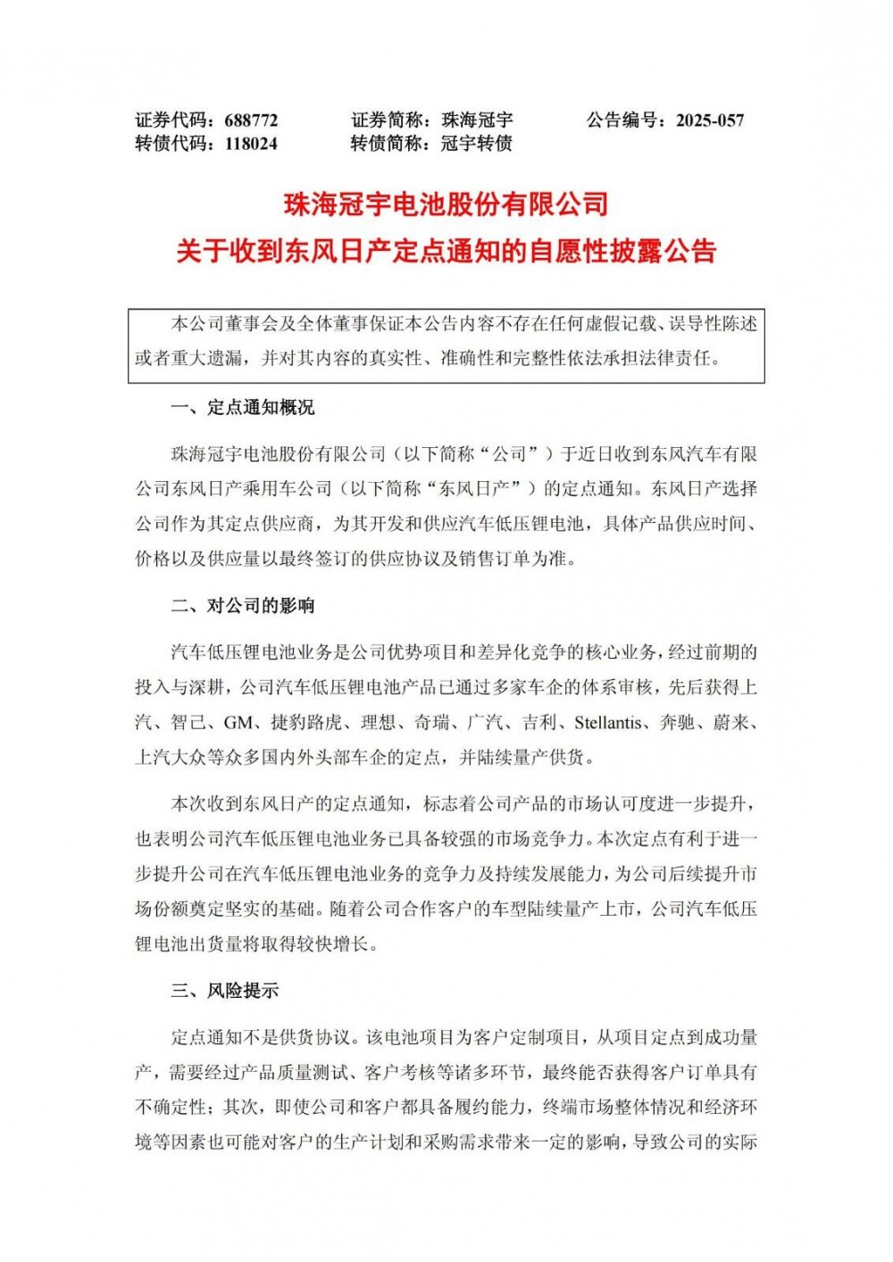 珠海冠宇表示,本次收到东风日产的定点通知,标志着公司产品的市场认可度进一步提升,也表明公司汽车低压锂电池业务已具备较强的市场竞争力。本次定点有利于进一步提升公司在汽车低压锂电池业务的竞争力及持续发展能力,为公司后续提升市场份额奠定坚实的基础。随着公司合作客户的车型陆续量产上市,公司汽车低压锂电池出货量将取得较快增长。