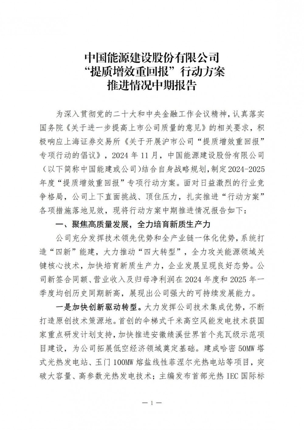 6月24日,中国能建发布中国能源建设股份有限公司“提质增效重回报”行动方案推进情况中期报告。