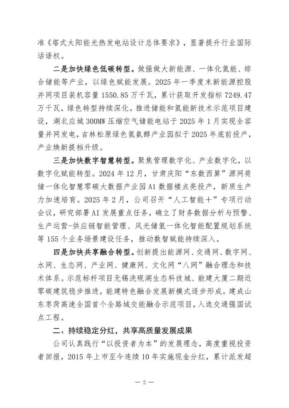 中国能建2025年一季度末新能源控股并网项目装机容量1550.85万千瓦,累计获取开发指标7249.47万千瓦,绿色转型持续深化。推进储能和氢能新技术示范项目建设,湖北应城300MW压缩空气储能电站于2025年1月实现全容量并网发电,吉林松原绿色氢氨醇产业园拟于2025年底前投产,产业焕新提档升级。