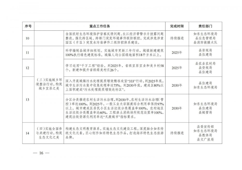 14.建立健全生态文化体系。构建以政府为主导、全社会广泛参与的生态文明教育网络。深入推进生态文明进学校、进社区、进企业宣传教育,优化利用污水处理展示馆、国家生态环境科普基地。精心实施生态文化建设工程,深度融合如东传统文化元素,匠心创作如东特色生态作品,打造海洋特色生态旅游品牌,让生态文明思想在如东大地深深扎根、蓬勃生长,绽放出璀璨的生态文化之花。(县委宣传部、如东生态环境局、县教体局、县文广旅局、县委社工部等按职责分工负责)