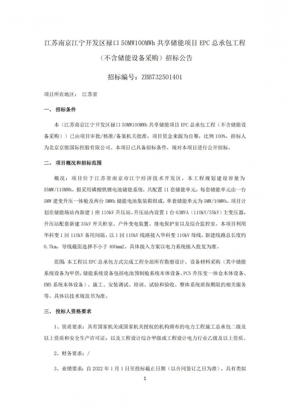 7月23日,江苏南京江宁开发区禄口50MW100MWh共享储能项目EPC总承包工程(不含储能设备采购)招标公告发布。
