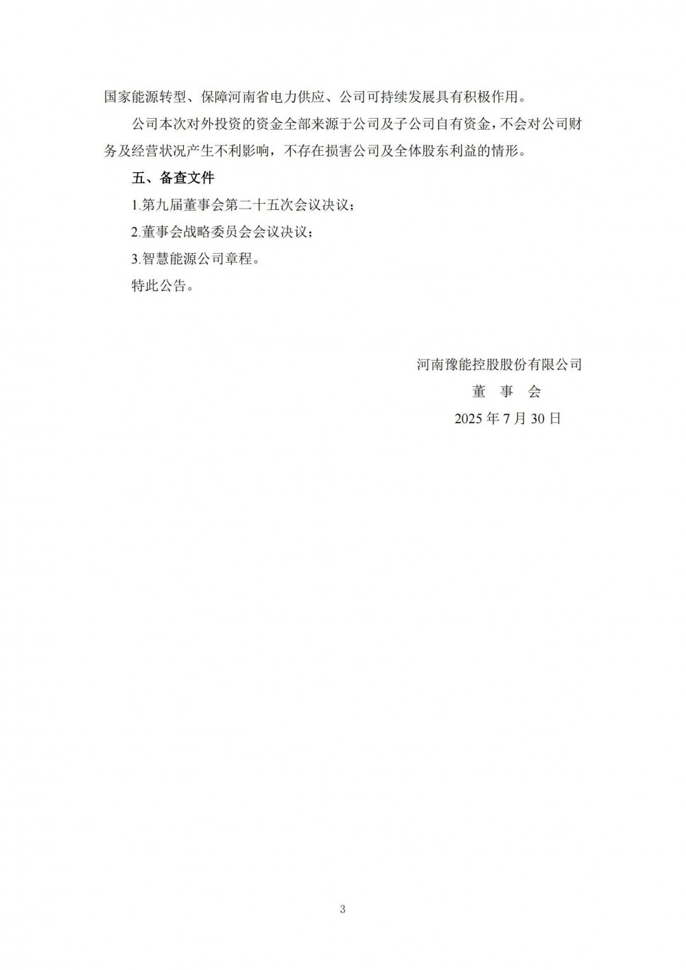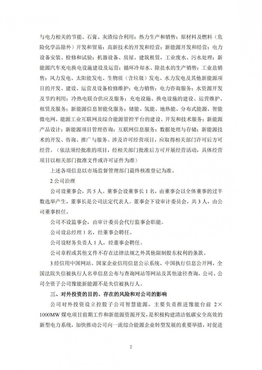豫能控股表示,公司对外投资设立控股子公司智慧能源,主要负责推进豫能台前2×1000MW煤电项目前期工作和新能源资源开发,是积极构建清洁低碳安全高效的新型电力系统,加快推动公司向一流综合能源企业转型发展的重要举措,对促进国家能源转型、保障河南省电力供应、公司可持续发展具有积极作用。