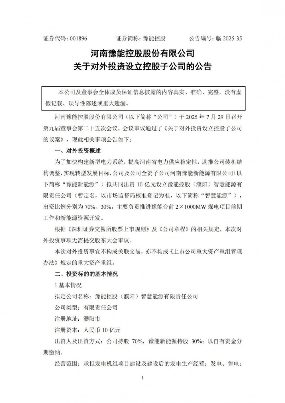 7月29日,豫能控股发布公告称,为了加快构建新型电力系统,提高河南省电力供应稳定性,助推公司装机结构调整,实现转型发展目标,公司及公司全资子公司河南豫能新能源有限公司拟共同出资10亿元设立豫能控股(濮阳)智慧能源有限责任公司(暂定名,以市场监督局核准登记为准,以下简称“智慧能源”),出资比例分别为70%、30%,主要负责推进豫能台前2×1000MW煤电项目前期工作和新能源资源开发。