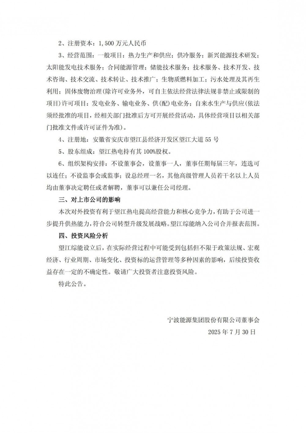 宁波能源表示,本次对外投资有利于望江热电提高经营能力和核心竞争力,有助于公司进一步提升供热能力,符合公司转型升级发展战略。望江综能纳入公司合并报表范围。