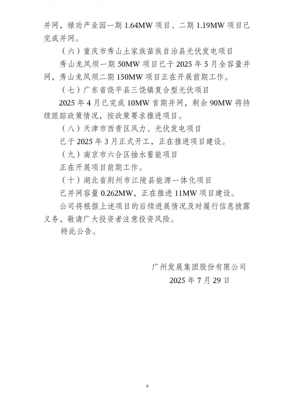 (六)重庆市秀山土家族苗族自治县光伏发电项目秀山龙凤坝一期 50MW 项目已于2025 年5 月全容量并网,秀山龙凤坝二期 150MW 项目正在开展前期工作。