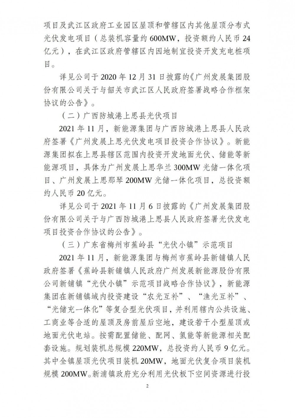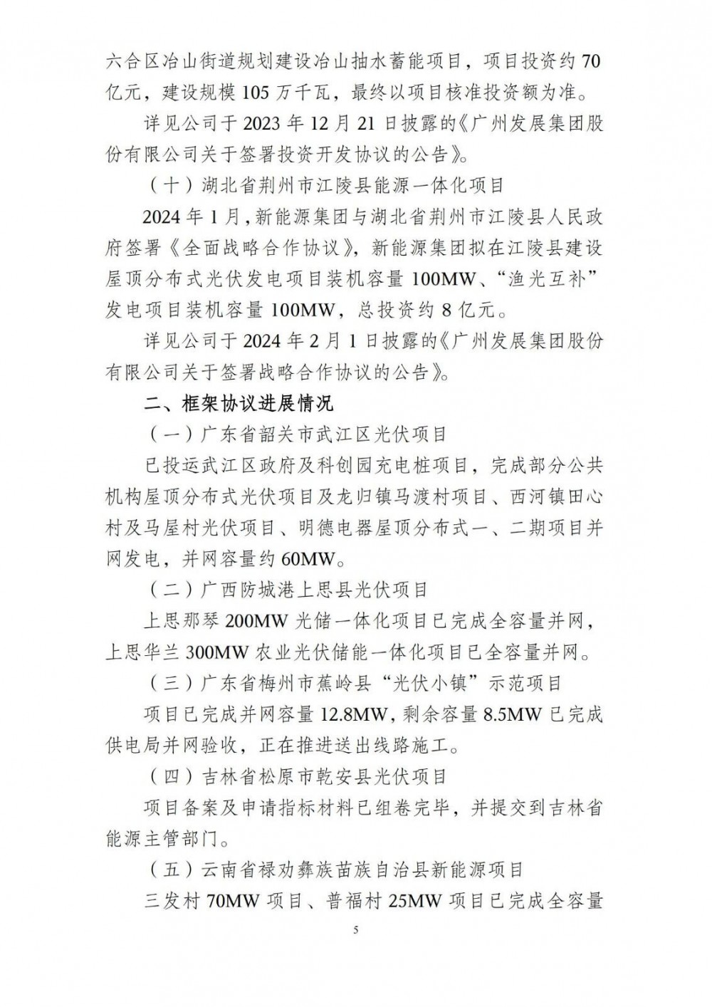 2020年以来,广州发展集团及属下全资子公司广州发展新能源集团股份有限公司与多地人民政府签署了多项新能源项目框架协议,现将该类项目框架协议进展情况公告如下: