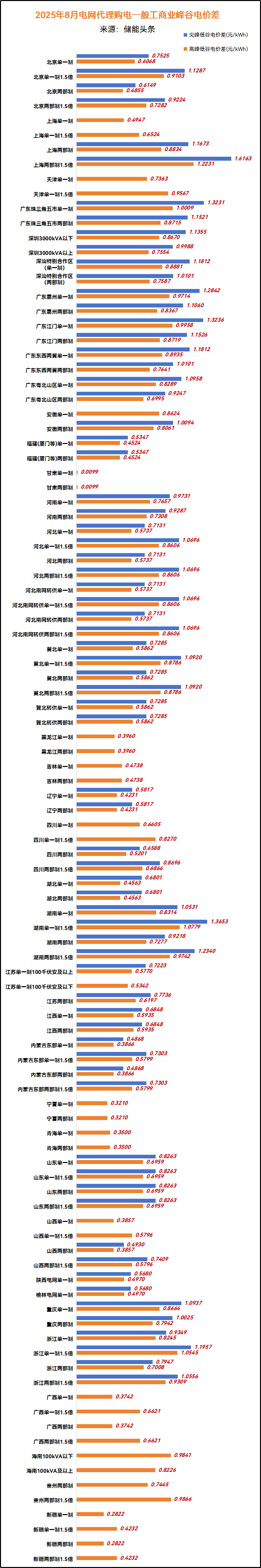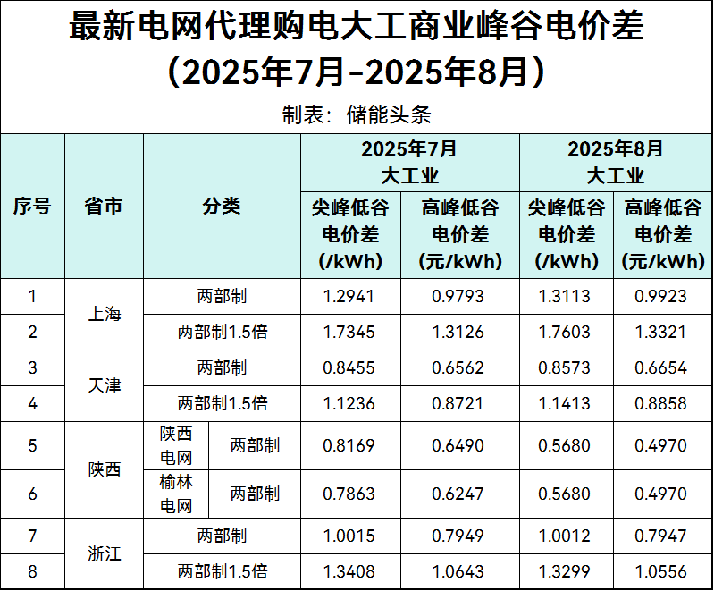 电力家了解到,2025年8月电网代购电价格中,全国峰谷价差最高的是上海,执行大工商业两部制1.5倍尖峰电价时,峰谷价差为1.7603元/kWh。