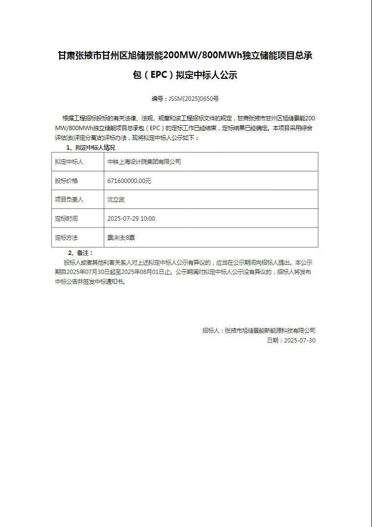 7月30日,甘肃张掖市甘州区旭储景能200MW/800MWh独立储能项目总承包(EPC)拟定中标人公示。