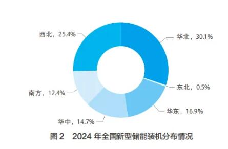 华北、西北为新型储能装机规模较大地区,装机规模分别为2224 万千瓦 /4942 万千瓦时、1871 万千瓦 /5201 万千瓦时,装机合计约占全国 55.5%。华东、华中、南方、东北地区装机占比分别为 16.9%、14.7%、 12.4%、0.5%。其中,华东地区占比较2023 年底提升8.6个百分点。