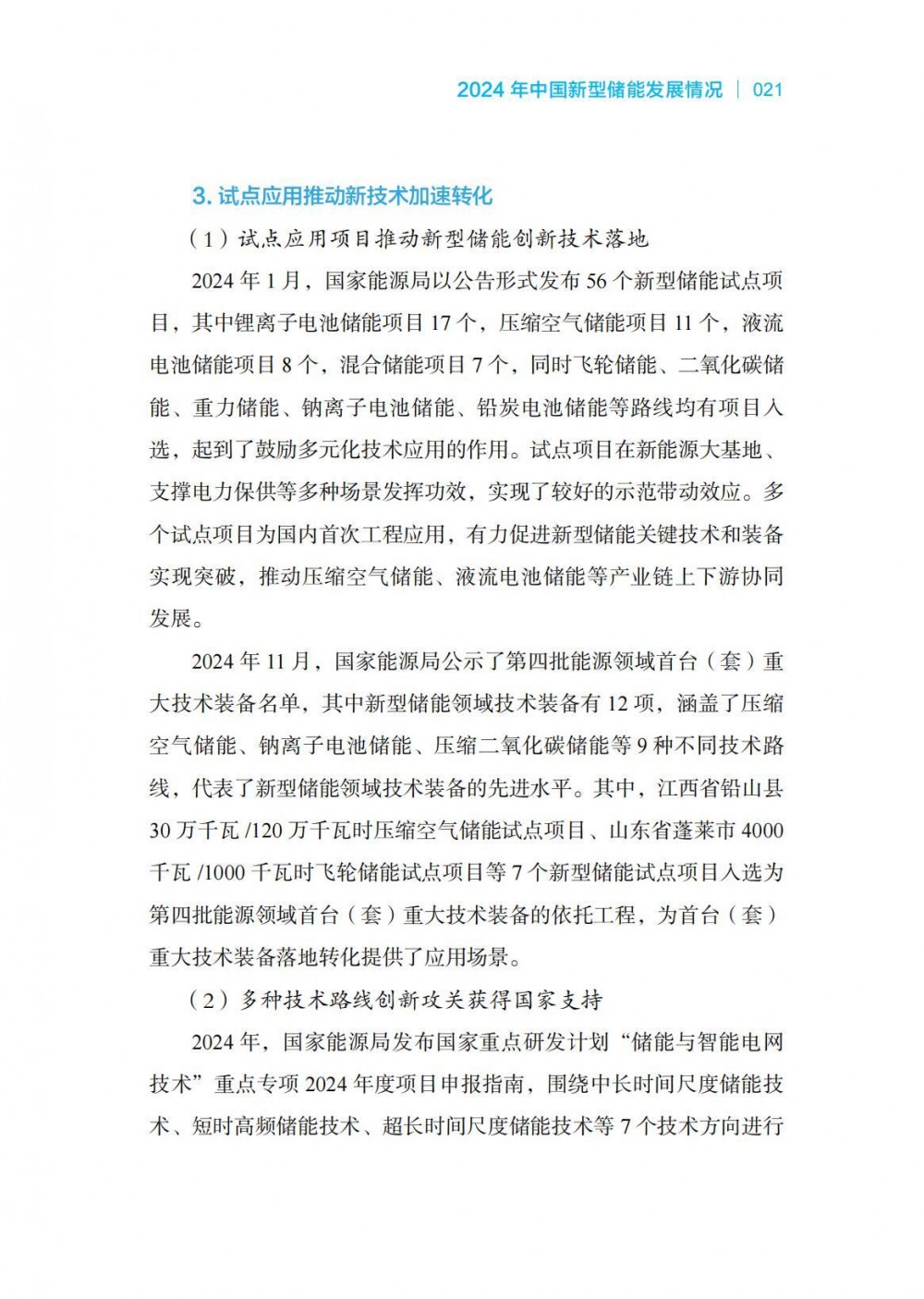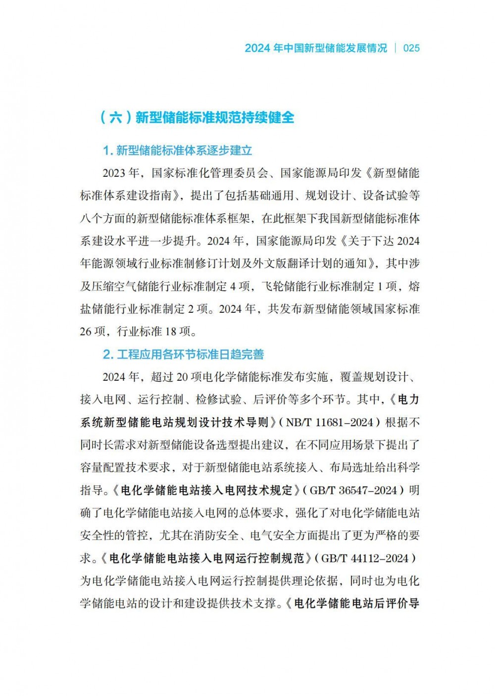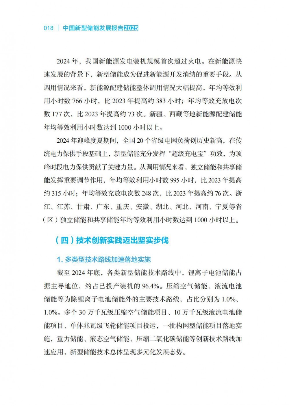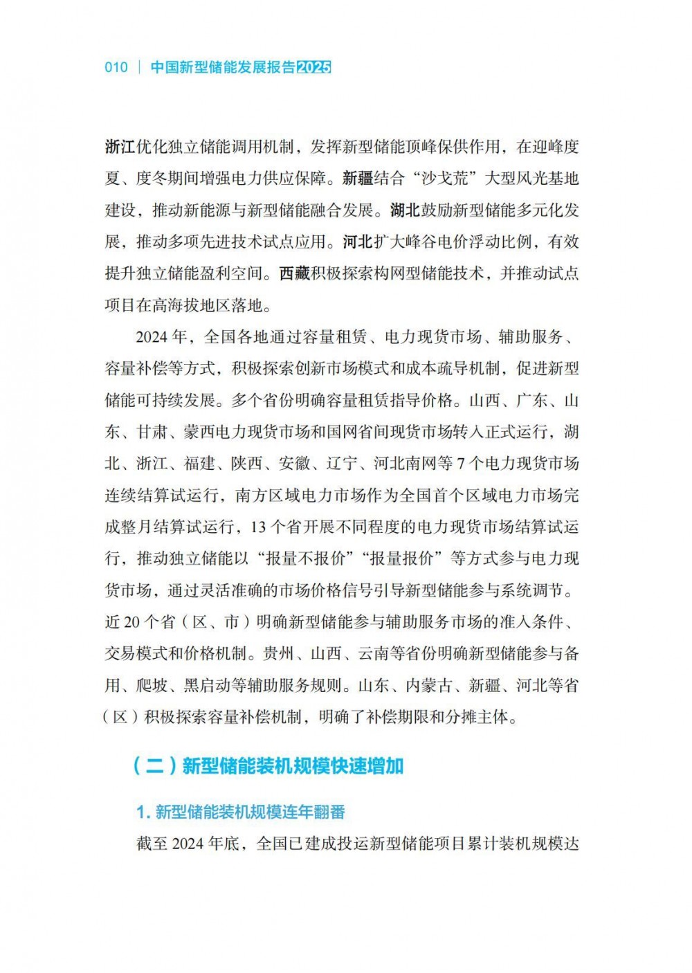 报告显示,新型储能装机规模连年翻番。截至 2024 年底,全国已建成投运新型储能项目累计装机规模达7376 万千瓦 /1.68 亿千瓦时,约为“十三五”末的 20 倍,较 2023 年 底增长超过 130%,全年新增新型储能装机 4237 万千瓦 /1.01 亿千瓦 时。全国新型储能平均储能时长 2.3 小时,较 2023 年底增加约 0.2 小 时,“十四五”以来储能时长呈上升趋势。
