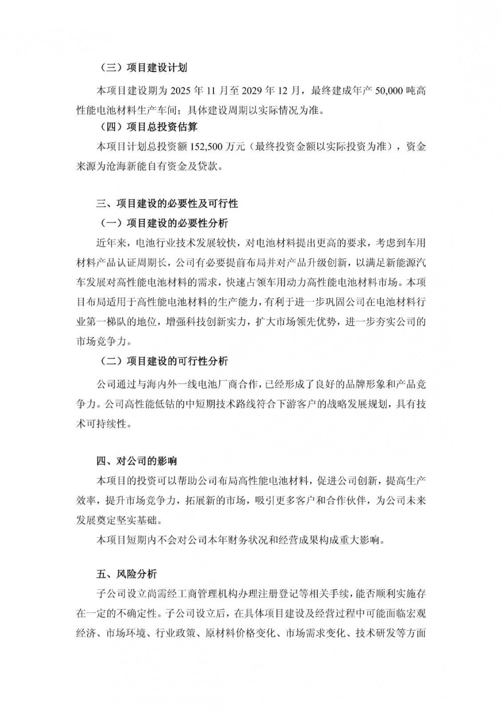 本项目计划总投资152,500万元(最终投资金额以实际投资为准),资金来源为沧海新能自有资金及贷款;项目建设内容为通过设备采购等,建成年产50,000吨高性能电池材料生产线;建设周期为50个月(具体建设周期以实际建设情况为准)。