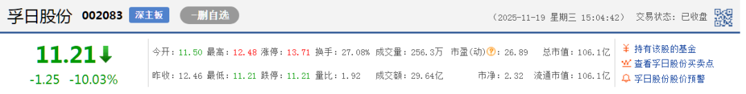 截至2025年11月19日,孚日股份以10.03%跌停收盘,收盘报价11.21元/股。