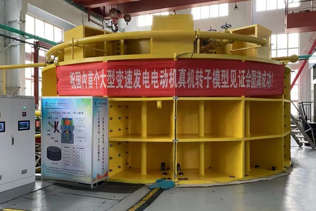 回望哈电集团变速抽水蓄能机组的研发之路,是几代人勇闯“无人区”的坚守与圆梦的历程。从20世纪90年代开启交流励磁电机理论研究与模型验证,到2016年完成丰宁二期项目模拟设计及转子模型研制;从2021年依托国家重点研发计划,成功研制10兆瓦变速海水蓄能发电电动机样机并完成带负载并网联调试验,再到当前,国内首次完成直径5米级立式1:1真机转子模型试验,世界电压/电流等级最高、难度最大的6.6千伏/万安培级1:1集电系统模型试验,国内首次提出的U/T型螺栓组合式端部固定结构的Bypass旁路通风模型试验等,分别通过行业专家见证和验收。研发团队突破了一个个关键核心技术瓶颈,每一步都凝聚着哈电人的心血与汗水,每一次突破都彰显着大国工匠的执着与坚守,每一项成果都镌刻着自主创新的坚定与豪迈。
