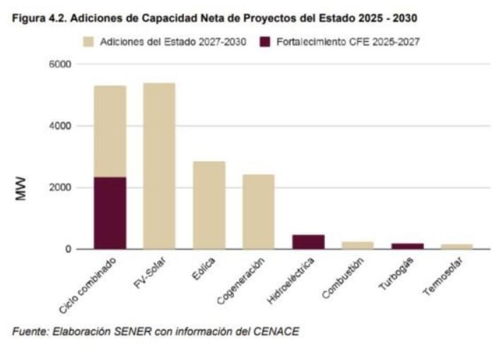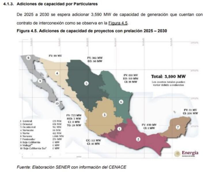 新增装机容量的区域分布遵循全国覆盖战略。预计2025年至2030年间新增装机容量最大的区域控制管理区(GCR)如下:半岛地区(3,842兆瓦);北部和东北部地区(3,497兆瓦);中部地区(3,282兆瓦);东部和西部地区合计(2,984兆瓦);以及下加利福尼亚州(1,774兆瓦)。这些数据包括发电和储能容量,其计算基于需求预测、工业增长、可再生能源并网容量以及节点可靠性标准。