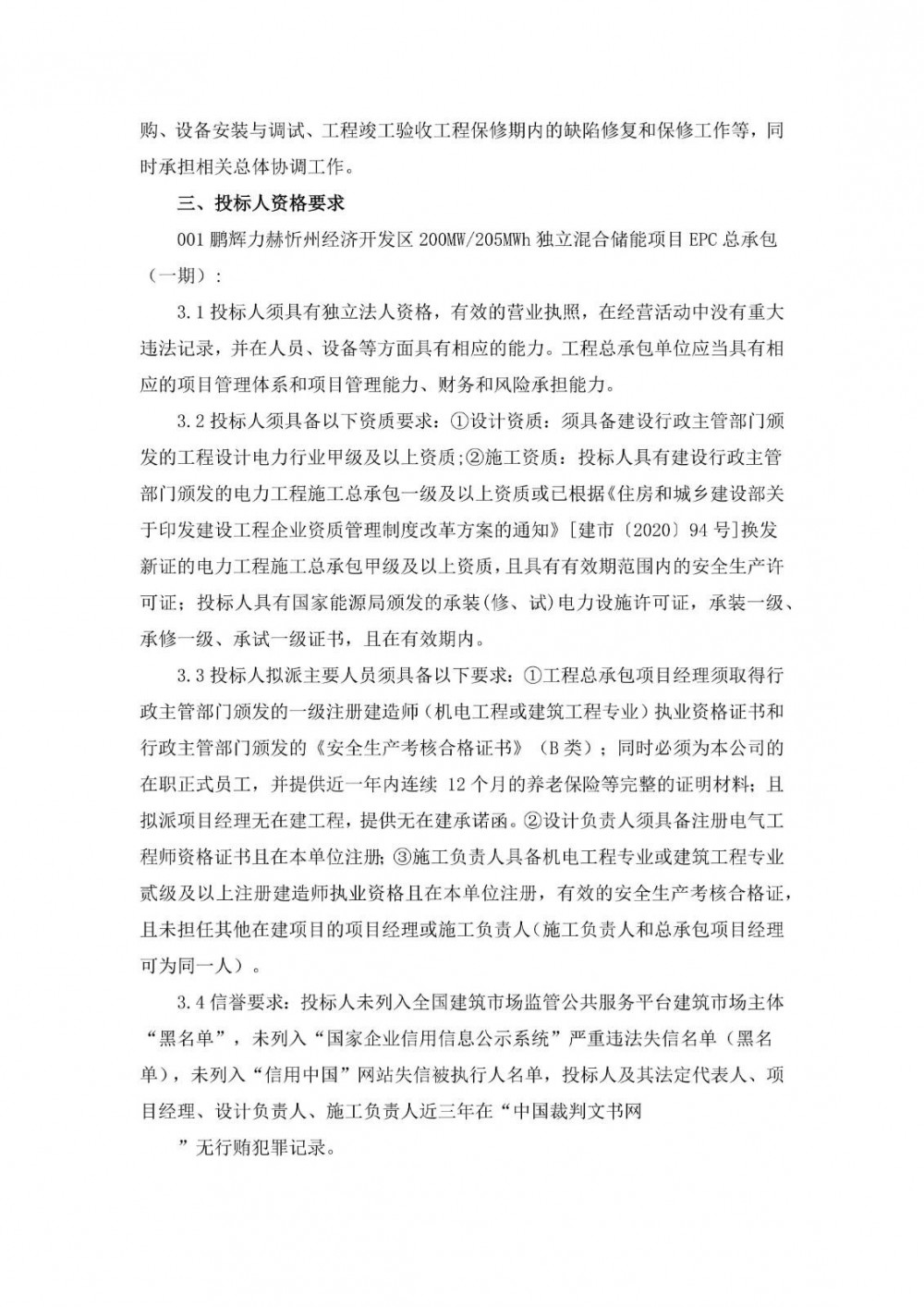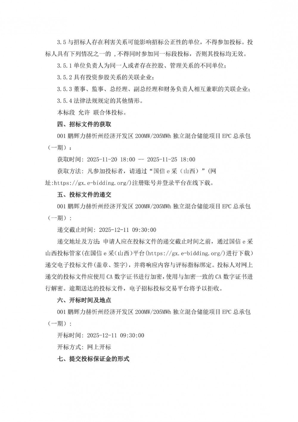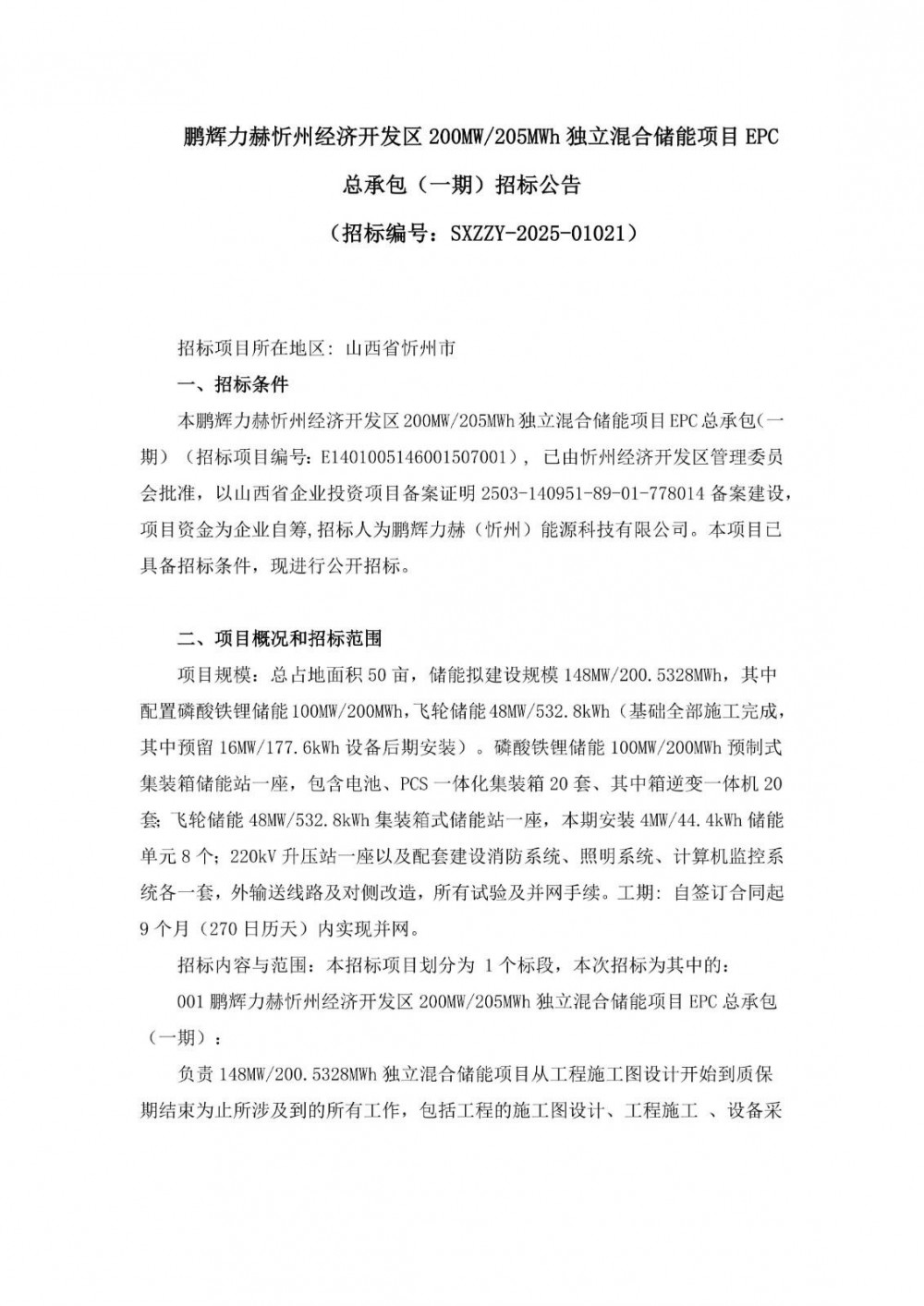 11月20日,鹏辉力赫忻州经济开发区200MW/205MWh独立混合储能项目EPC总承包(一期)招标公告发布。