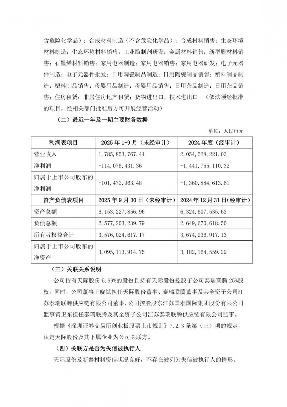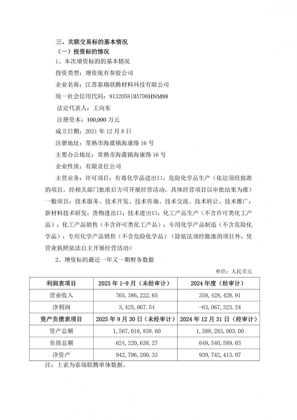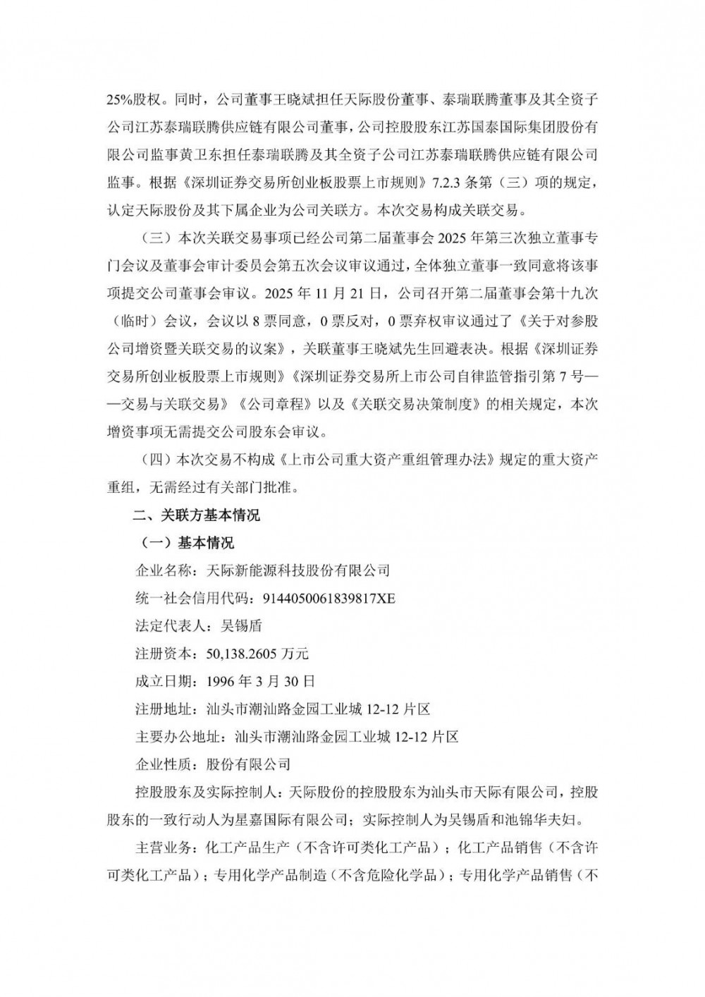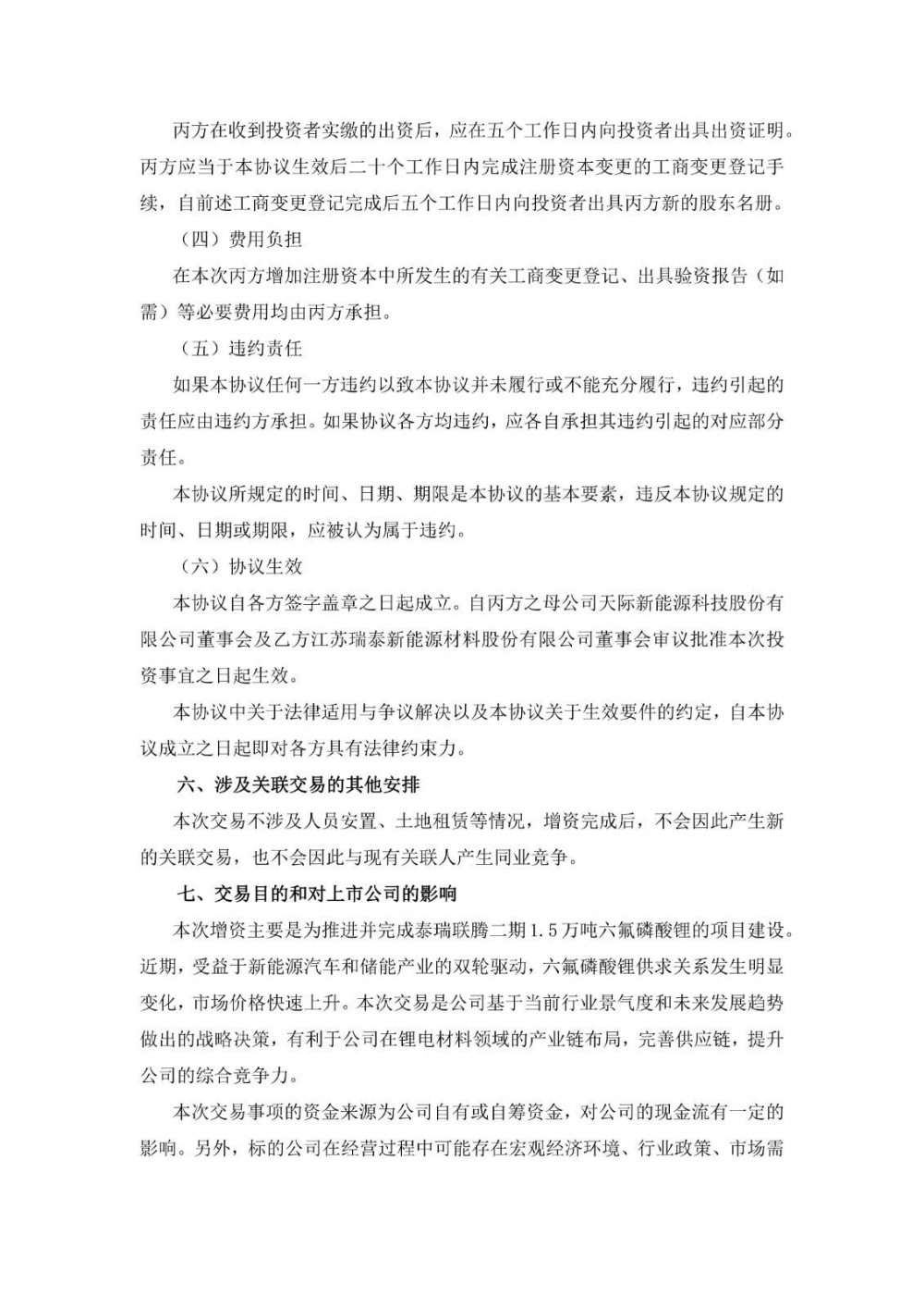 根据目前产能释放情况及未来发展趋势,泰瑞联腾拟推进并完成二期1.5万吨六氟磷酸锂项目建设。基于上述项目的资金需求,公司拟与关联方天际股份的全资子公司新泰材料以货币资金方式向泰瑞联腾增资20,000万元,本次新增注册资本按1元/股计入注册资本。其中新泰材料出资15,000万元,公司出资5,000万元。本次增资完成后,公司仍持有泰瑞联腾25%股权。