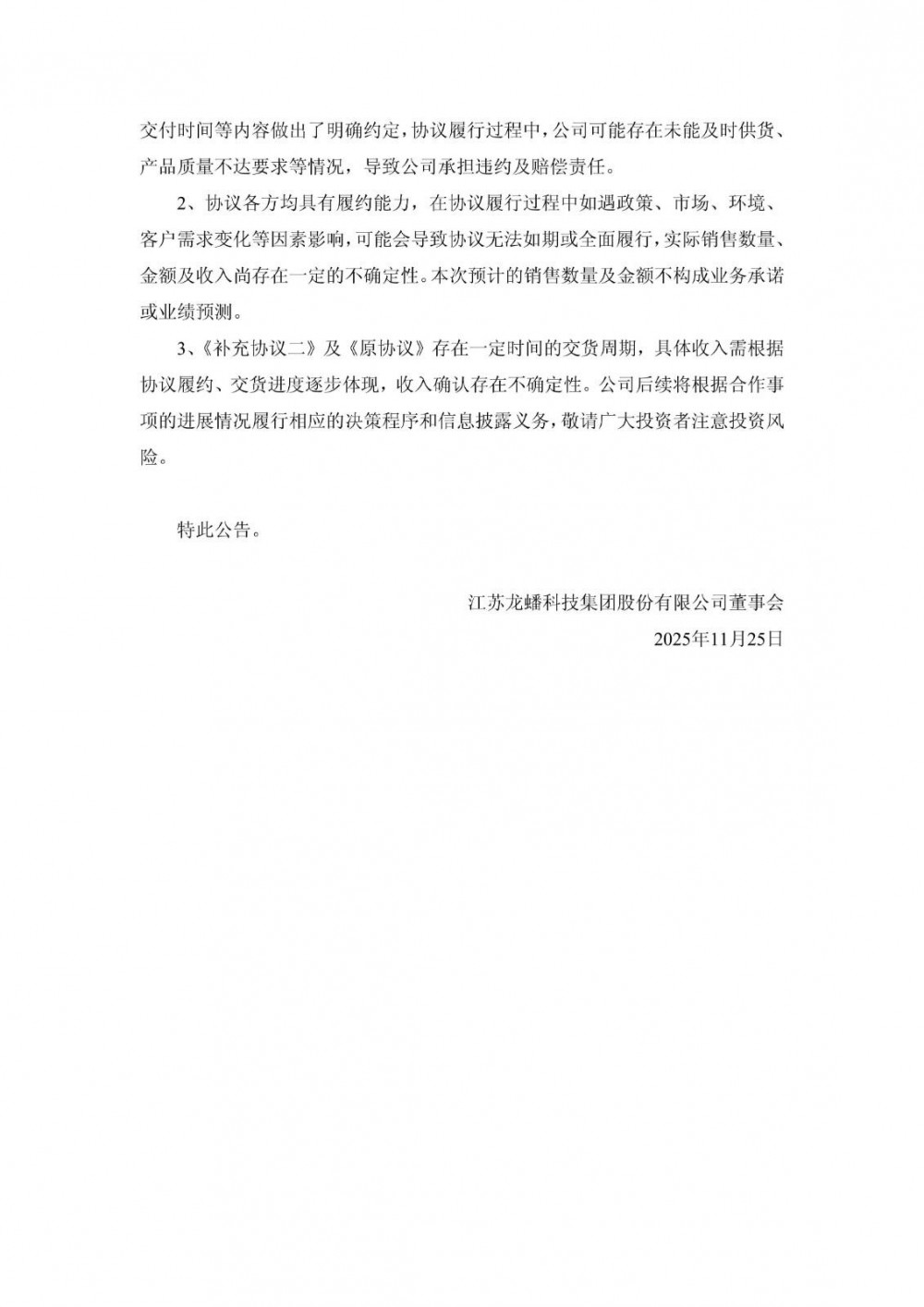 11月24日,龙蟠科技发布公告称,宣布其控股子公司常州锂源新能源科技有限公司及控股孙公司南京锂源纳米科技有限公司与楚能新能源股份有限公司旗下三家全资子公司共同签署《生产材料采购合作协议之补充协议二》(以下简称《补充协议二》),对原采购协议进行重大修订。