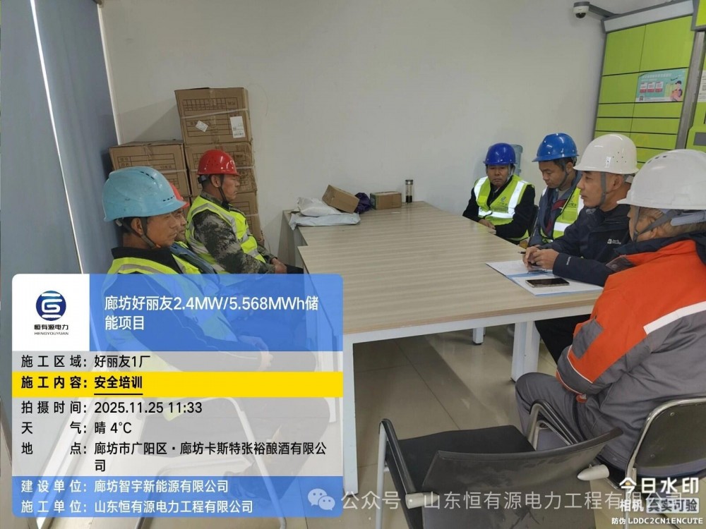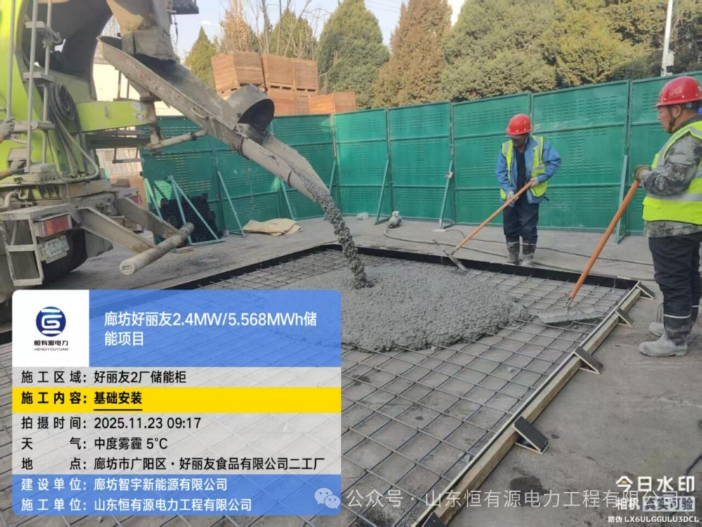冬潮涌动施工忙,储能布局启新程。为深入贯彻国家“双碳”战略部署,积极响应能源结构转型号召,2025年11月25日,由山东恒有源电力工程有限公司承建的重点储能项目——“廊坊好丽友2.425MW/5.597MWh储能项目”正式破土动工。这既是公司加码储能赛道、完善新能源产业链的关键举措,更是助力构建新型电力系统、推动能源变革的重要实践,为实现清洁低碳、安全高效的能源体系注入强劲动能。