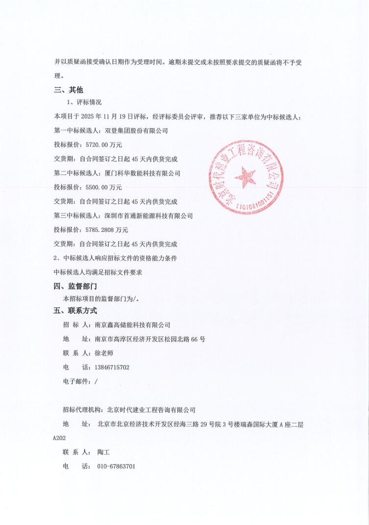 第一中标候选人:双登集团股份有限公司,投标报价:5720.00万元,折合单价0.572元/Wh;第二中标候选人:厦门科华数能科技有限公司,投标报价:5500.00万元,折合单价0.55元/Wh;第三中标候选人:深圳市首通新能源科技有限公司,投标报价:5785.2808万元,折合单价0.5785元/Wh。
