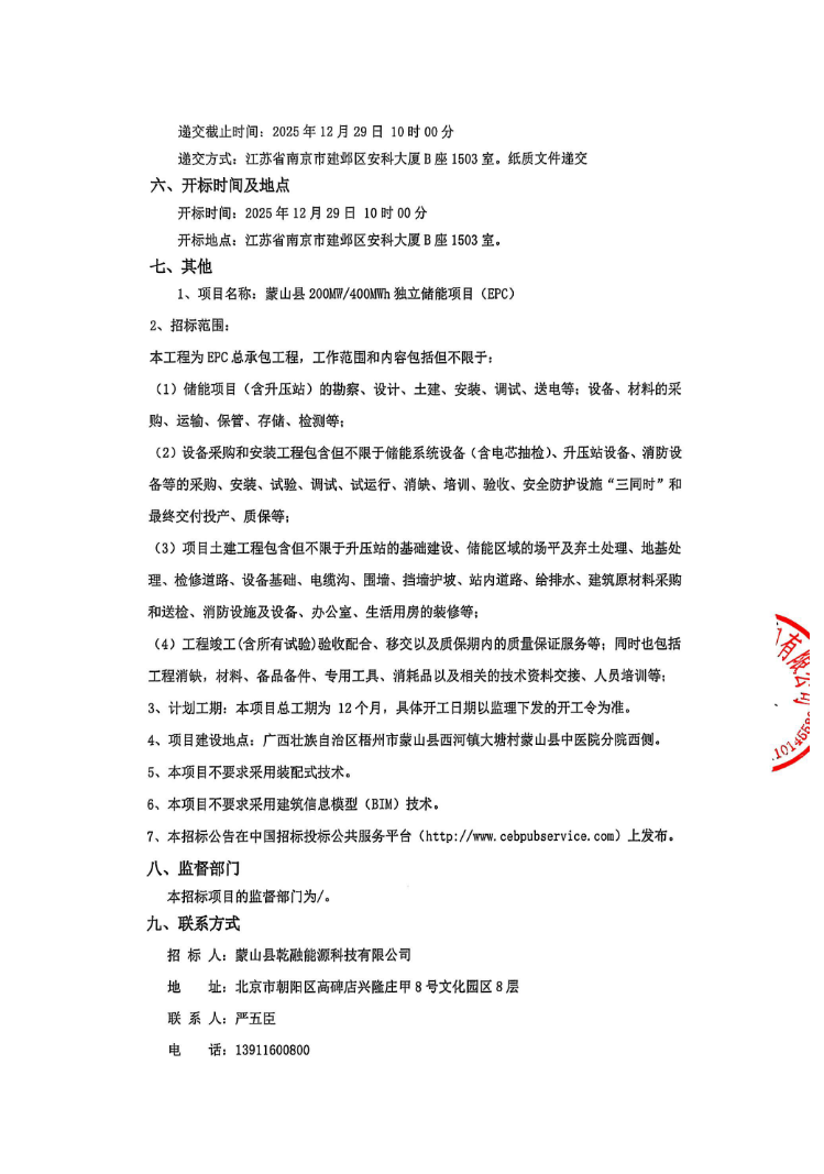 电力家获悉,11月27日,蒙山县200MW/400MWh独立储能项目(EPC)招标公告发布,招标人为蒙山县乾融能源科技有限公司。