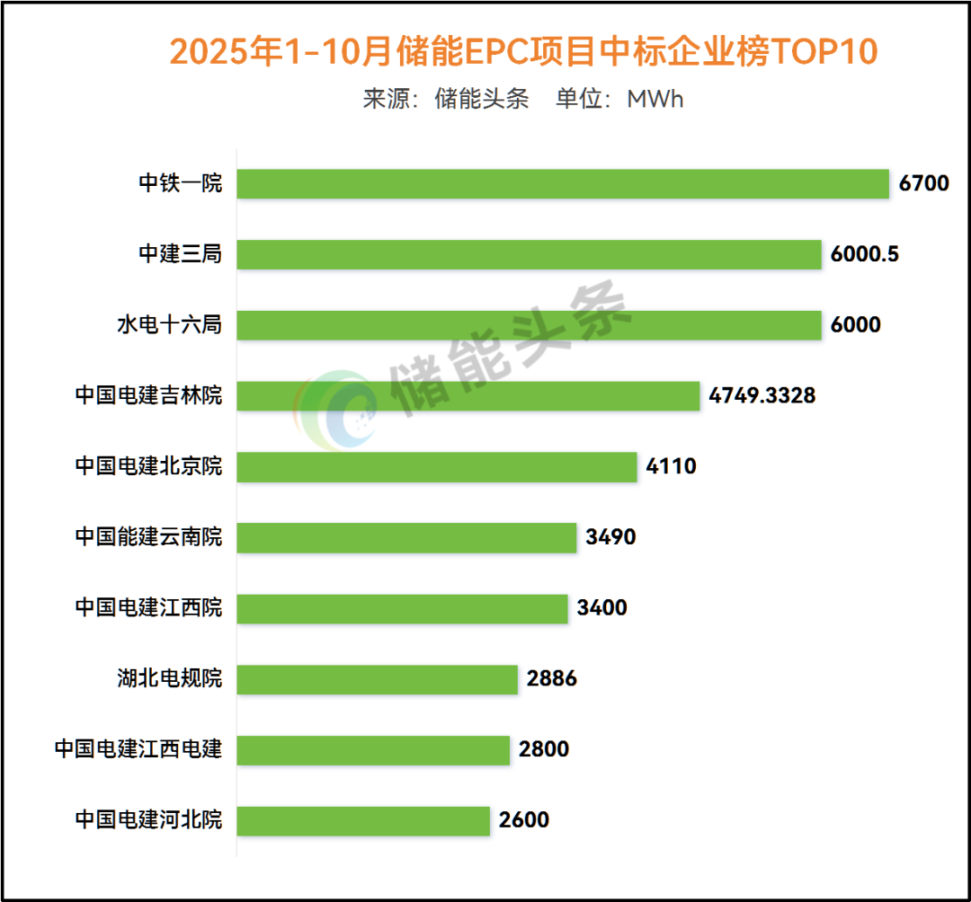 在储能项目EPC(含PC、EC)总承包中标排行榜中,中铁一院中标6700MWh列第一,中建三局中标6000.5MWh排第二,水电十六局中标6000MWh列第三,中国电建吉林院中标4749.3328MWh列第四;紧接着分别是中国电建北京院中标4110MWh、中国能建云南院中标3490MWh、中国能建江西院中标3400MWh、湖北电规院中标2886MWh、中国能建江西电建中标2800MWh、中国电建河北院中标2600MWh。(注:其中包括以牵头人中标的项目)