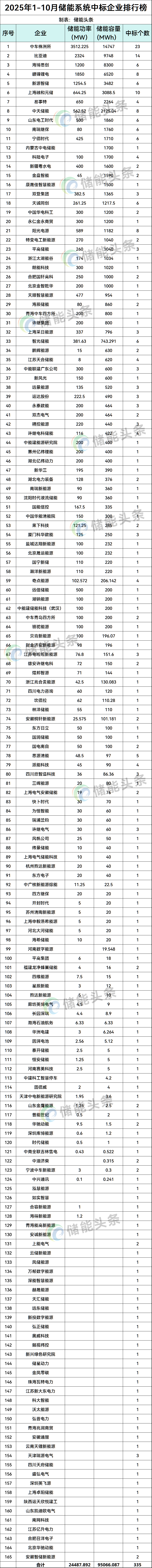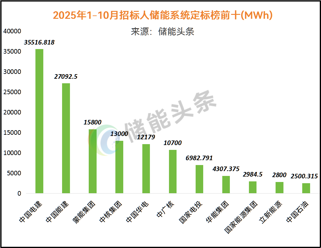 在定标规模上,根据电力家不完全统计,2025年1-10月定标规模合计95.8GW/347.4GWh(含集采),其中,央企定标容量168.9GWh,占比为49%;国企开标101GWh,占比29%;民营企业开标77.467GWh,占22%;中国能建、中国电建、中国华电、中核集团、中广核、国家电投定标规模超10GWh。