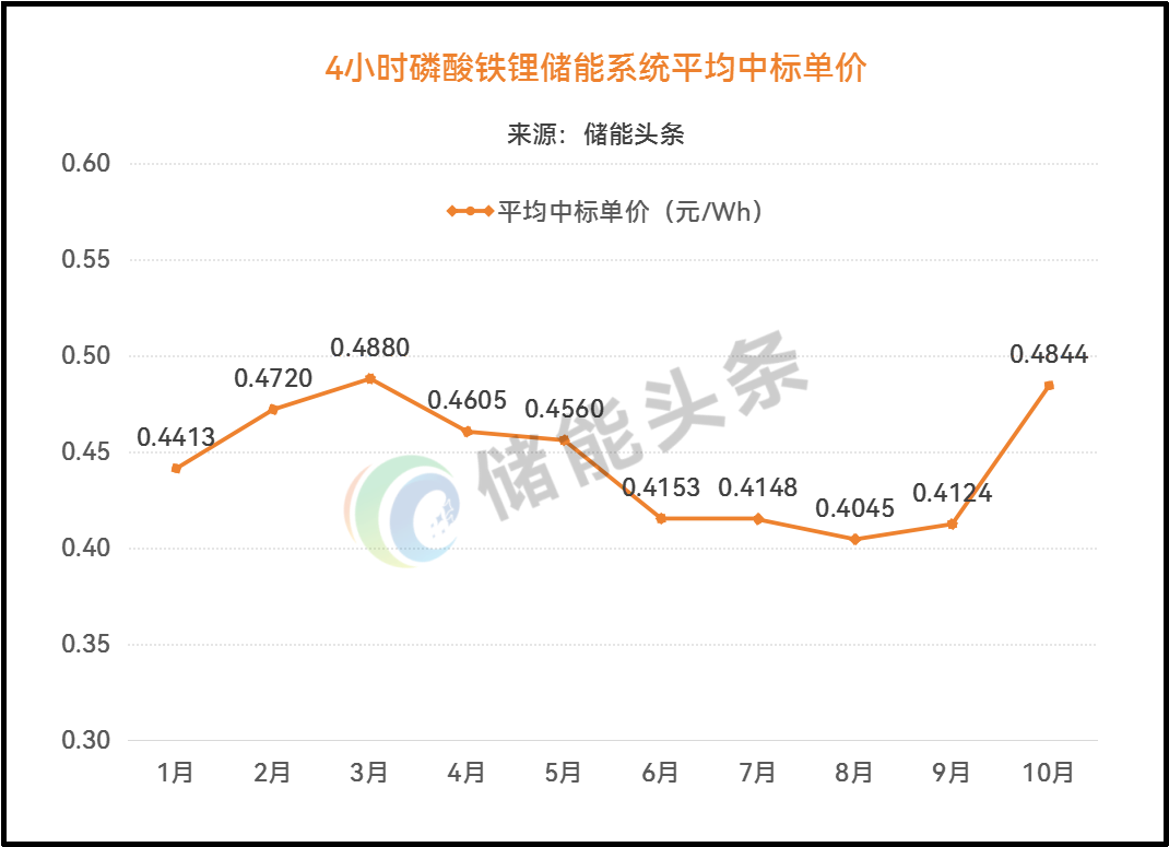 按月平均中标单价计算,10月4小时储能系统平均中标单价为0.4844元/Wh,较9月中标单价0.4124元/Wh增长17.46%。1-10月,4小时磷酸铁锂储能储能系统中标单价在0.3891~0.6564元/Wh之间,均价为0.441元/Wh。
