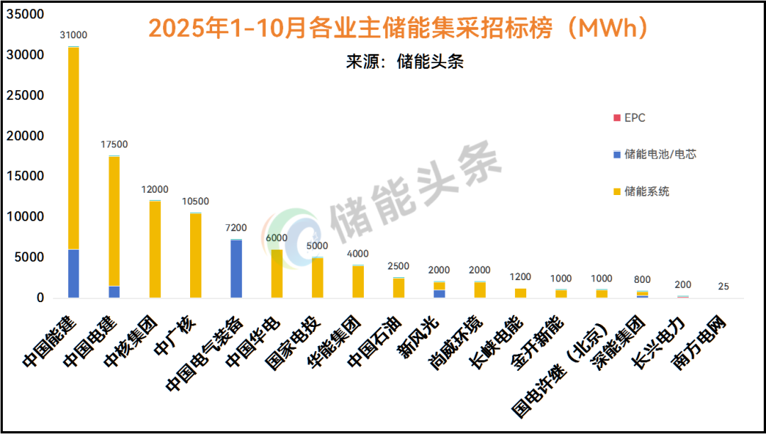 2025年1-10月完成储能系统集采的招标人有中国能建、中国电建、中核集团、中广核、华电、华能、中国石油、尚威环境、新风光、南方电网等企业,规模为87.725GWh 累计完成16000MWh储能电池集采工作 规模至少200MWh储能EPC框架招标