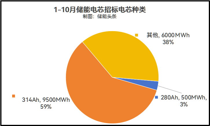 据电芯公开中标不完成统计,10月没有新的电芯集采开标,1-10月电芯集采规模为16000MWh,其中采购以314Ah电芯为主,比例占到60%,280Ah电芯招标数量较少。