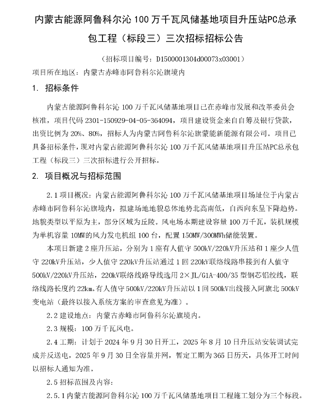 100台10MW!百万千瓦风储基地项目升压站PC工程招标