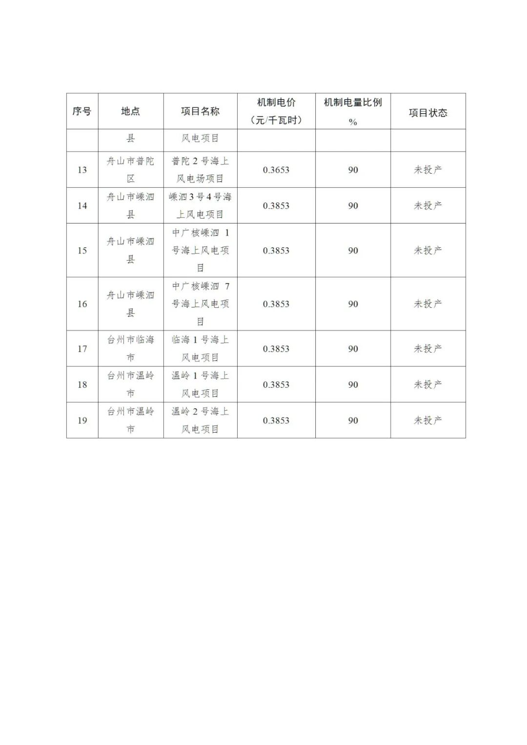 根据通知显示,清单共包含19个海上风电项目,其中,18个海上风电项目机制电价均为0.3853元/kWh,仅普陀2号海上风电场项目机制电价为0.3653元/kWh。机制电量比例均为90%。