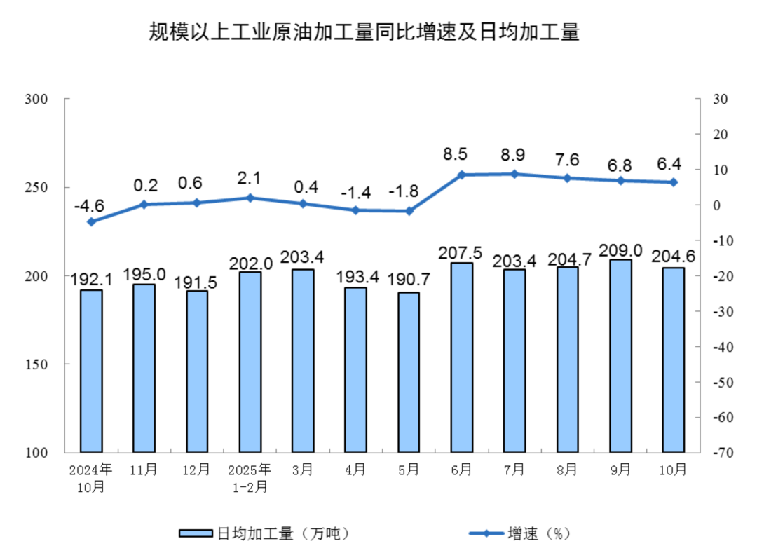 原油加工平稳增长。10月份,规上工业原油加工量6343万吨,同比增长6.4%;日均加工204.6万吨。