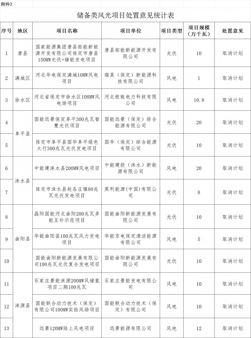 河北保定市拟调整储备类风光项目13个,规模合计136.8万千瓦,其中,风电项目7个,规模合计68.8万千瓦,光伏项目6个,规模合计68万千瓦,处置意见均为取消计划。