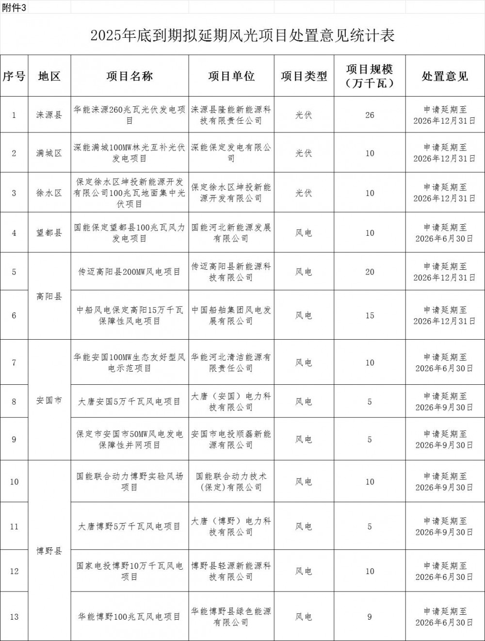 河北保定市2025年底到期拟延期风光项目13个,规模合计145万千瓦,其中,风电项目10个,规模合计99万千瓦,光伏项目3个,规模合计46万千瓦。