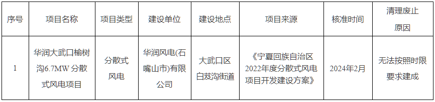 经梳理,华润大武口榆树沟6.7MW分散式风电项目(2022年度)仍未实质性开工建设,无法按照时限要求建成,按要求进行废止。