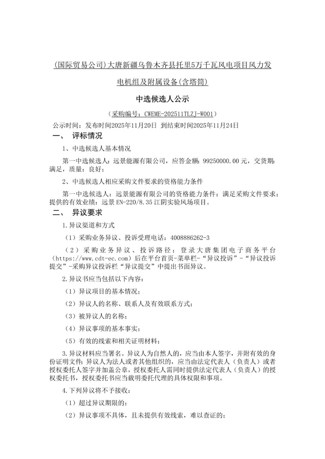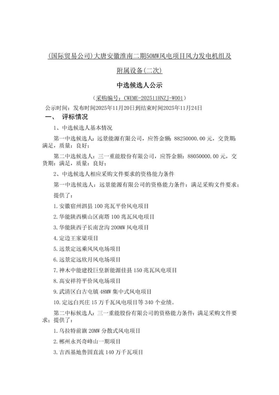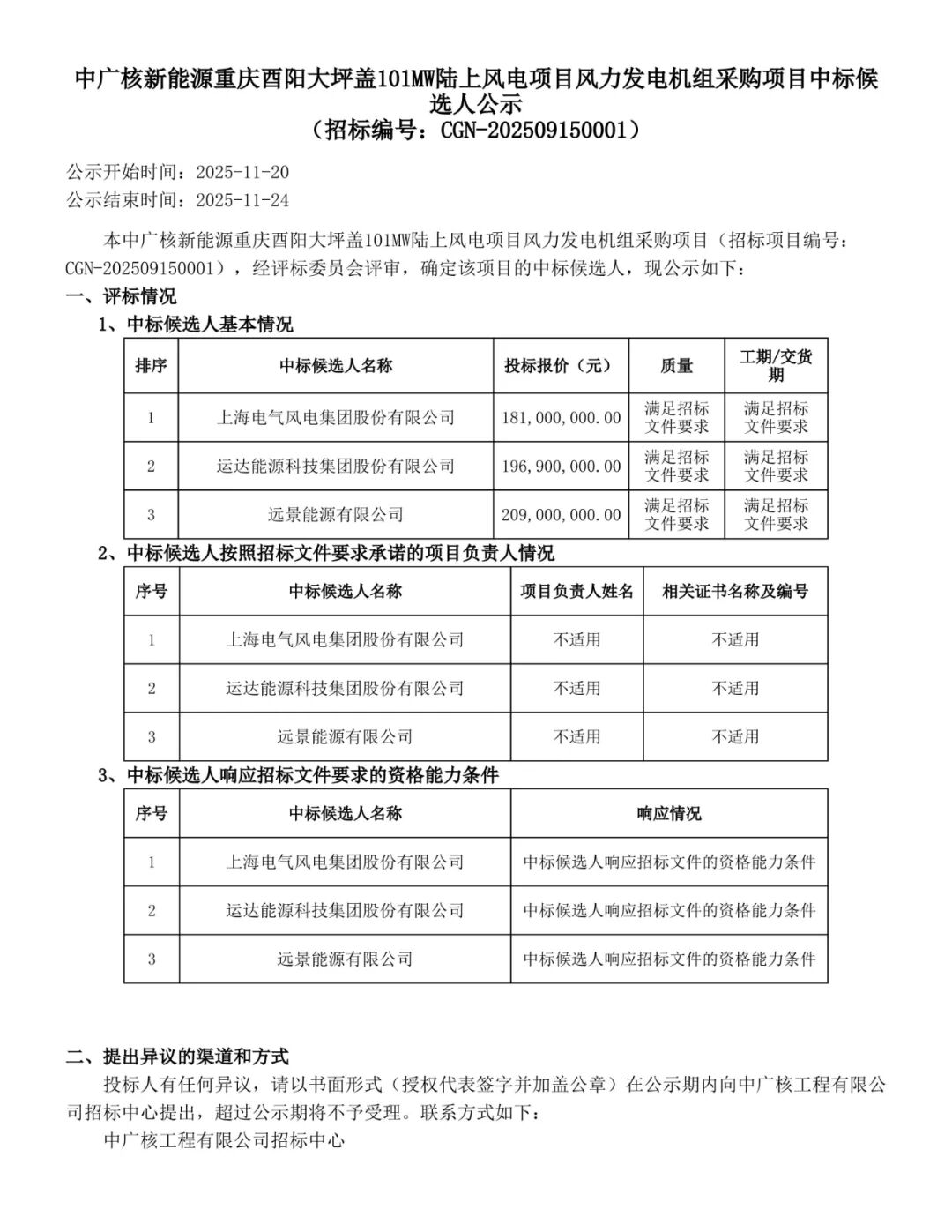 根据公示,远景能源、电气风电作为第一中标候选人预中标。