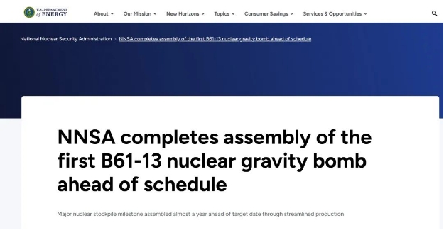 美东时间5月7日,美国国家核安全局代理局长特蕾莎罗宾斯(Teresa Robbins)曾告诉众议院军事委员会成员:NNSA预计在本月晚些时候实现B61 Mod 13的首个生产单位,几乎比计划提前了整整一年。