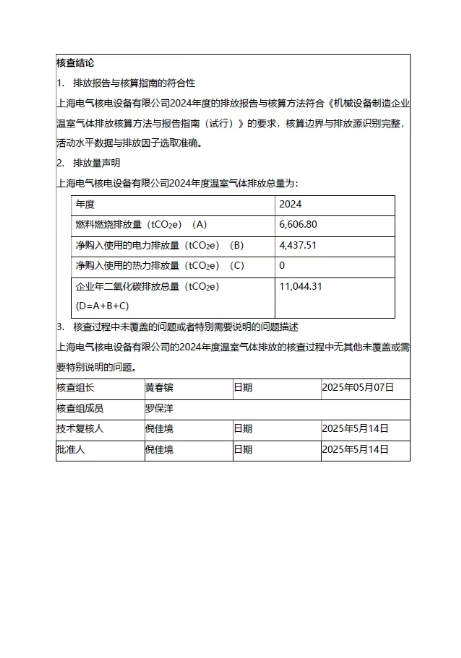 根据集团双碳办公室部署,由上海电气集团数字科技有限公司作为核查机构,对上海电气核电设备有限公司(以下简称上核公司)2024年度碳排放工作开展碳核查工作。此次核查严格依据GB∕T 32150-2015 工业企业温室气体排放核算和报告通则》及《机械设备制造企业温室气体排放核算方法与报告指南(试行)》,上核公司完成碳核查工作,并获得温室气体排放核查报告。