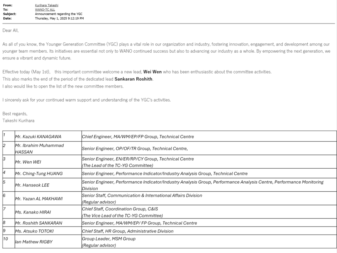 作为WANO推动核电行业可持续发展和青年人才培养的重要平台,TC(东京中心)YG(Younger Generation)委员会肩负着统筹东京中心青年工作的重任,其职责包括:组织成员公司及电站间的青年交流项目、促进区域中心间合作、推动知识与经验的传承、制作宣传视频、定期举办YG论坛等。