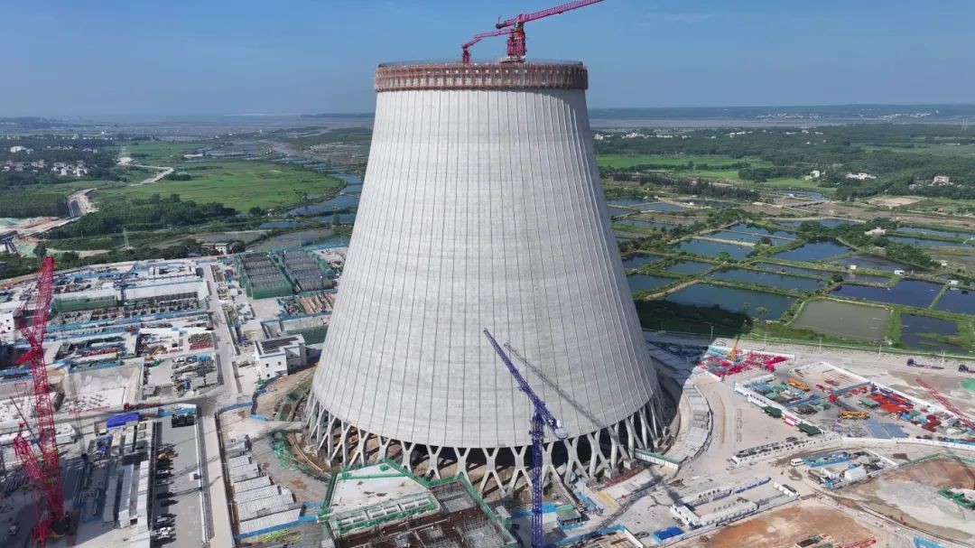 6月2日,世界核电第一大塔国家电投广东廉江核电项目1号机组冷却塔筒壁第100节混凝土浇筑顺利完成,塔体高度达到161米,标志着冷却塔主体结构稳步成型,为后续双曲线收束段施工奠定了坚实基础。