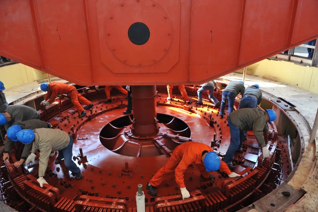 ▲紧水滩电站机组转子顺利吊入定子机坑|陶萱 摄